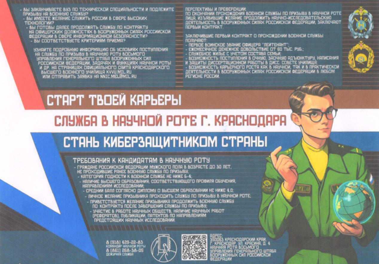 Уважаемые выпускники, подлежащие призыву для прохождения срочной военной службы, для Вас предлагается информационный материал на тему «Служба в «Научной роте» г. Краснодар для граждан, имеющих высшее образование».