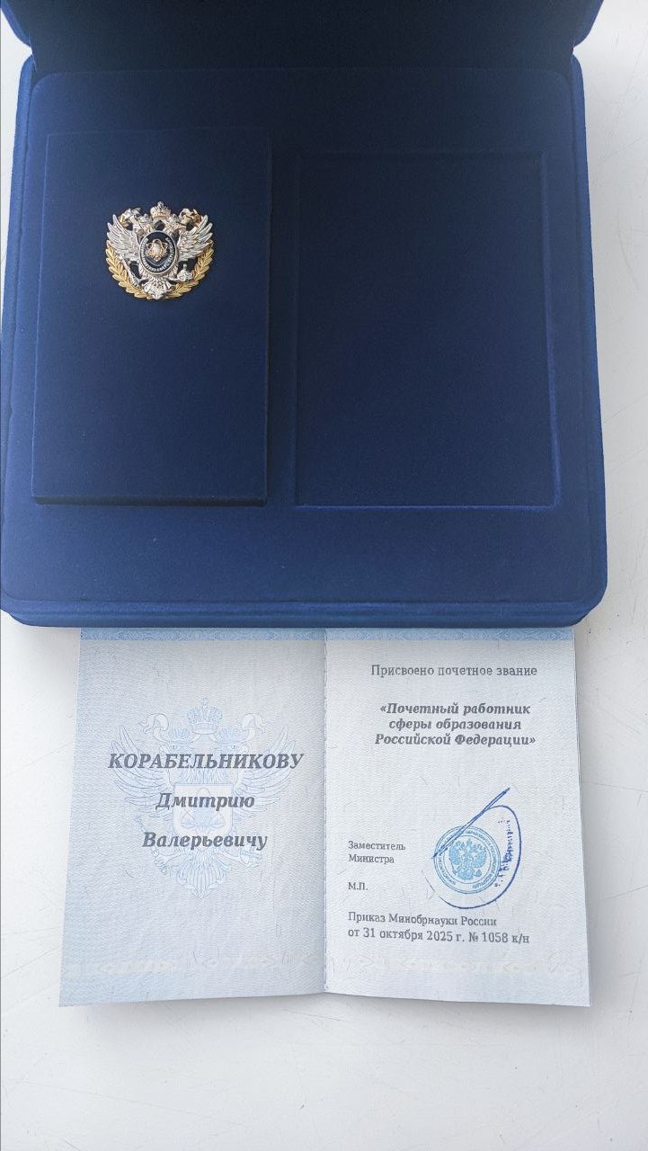 Первому заместителю директора по учебной работе Дмитрию Валерьевичу Корабельникову за значительные заслуги в сфере образования и многолетний добросовестный труд присвоено почетное звание “Почетный работник сферы образования Российской Федерации”. Это признание профессионализма, дисциплины и преданности делу. Пусть эта награда станет отправной точкой для новых свершений в подготовке квалифицированных, востребованных, конкурентоспособных кадров для предприятий города Бийска.