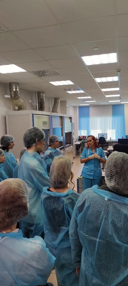 Особый интерес у будущих биотехнологов вызвало посещение микробиологической лаборатории. Её начальник Татьяна Вячеславовна Стешина наглядно показала, как обеспечивается стерильность и безопасность натуральной продукции, и какое оборудование используется для этих целей.