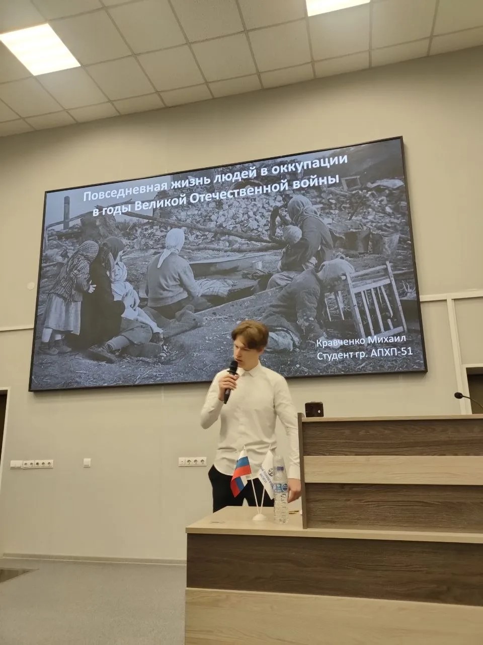 Первые места в двух секциях достались Дарье Поляковой (ПС-51) и Владиславу Дегтяреву (ПС-51). Дарья проанализировала топонимику, посвященную Сталинградским снайперам, а Владислав изучил жизненные траектории и отношение участников Белого движения к Великой отечественной войне и своей родине в период опасности. Второе место поделили Брагина Мария (ИСТ-51), Галицких Анастасия (БиВ-31), Герасименко Михаил (ИСТ-51), Пивоваров Александр (БиВ-51). Первокурсники рассказывали об экспериментах на детях в нацистских лагерях ( Шеповалов А., ХТПК-51), восприятии войны в тылу (Кнауб К., АПХП-51), повседневной жизни людей в оккупации (Кравченко М., АПХП-51). Большой резонанс вызвал доклад Д. Бусова (БТ-51 ) по анализу компьютерных игр о Великой отечественной войне. Д. Чернышов (ИСТ-51) попытался понять, почему после войны стал формироваться негативный образ контрразведки СМЕРШ.